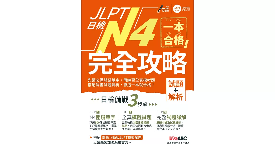 博客來-一本合格!JLPT日檢完全攻略(試題+解析)N4:【1書+1 CD-ROM電腦互動光碟(含單字例句.試題MP3)】訂購網址: https://www.books.com.tw/exep/assp.php/87926/products/0010823538?utm_source=87926&utm_medium=ap-books&utm_content=recommend&utm_campaign=ap-201906