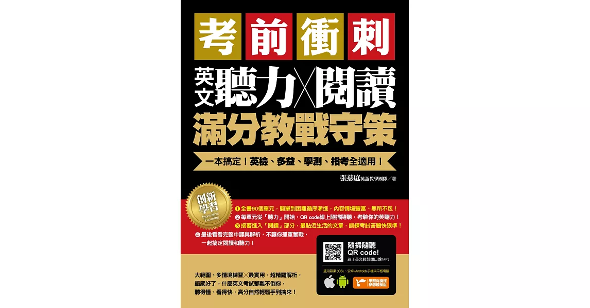 博客來-考前衝刺,英文聽力╳閱讀滿分教戰守策:一本搞定英檢、多益、學測、指考全適用(附隨掃隨聽QR code)訂購網址: https://www.books.com.tw/exep/assp.php/87926/products/0010813533?utm_source=87926&utm_medium=ap-books&utm_content=recommend&utm_campaign=ap-201906